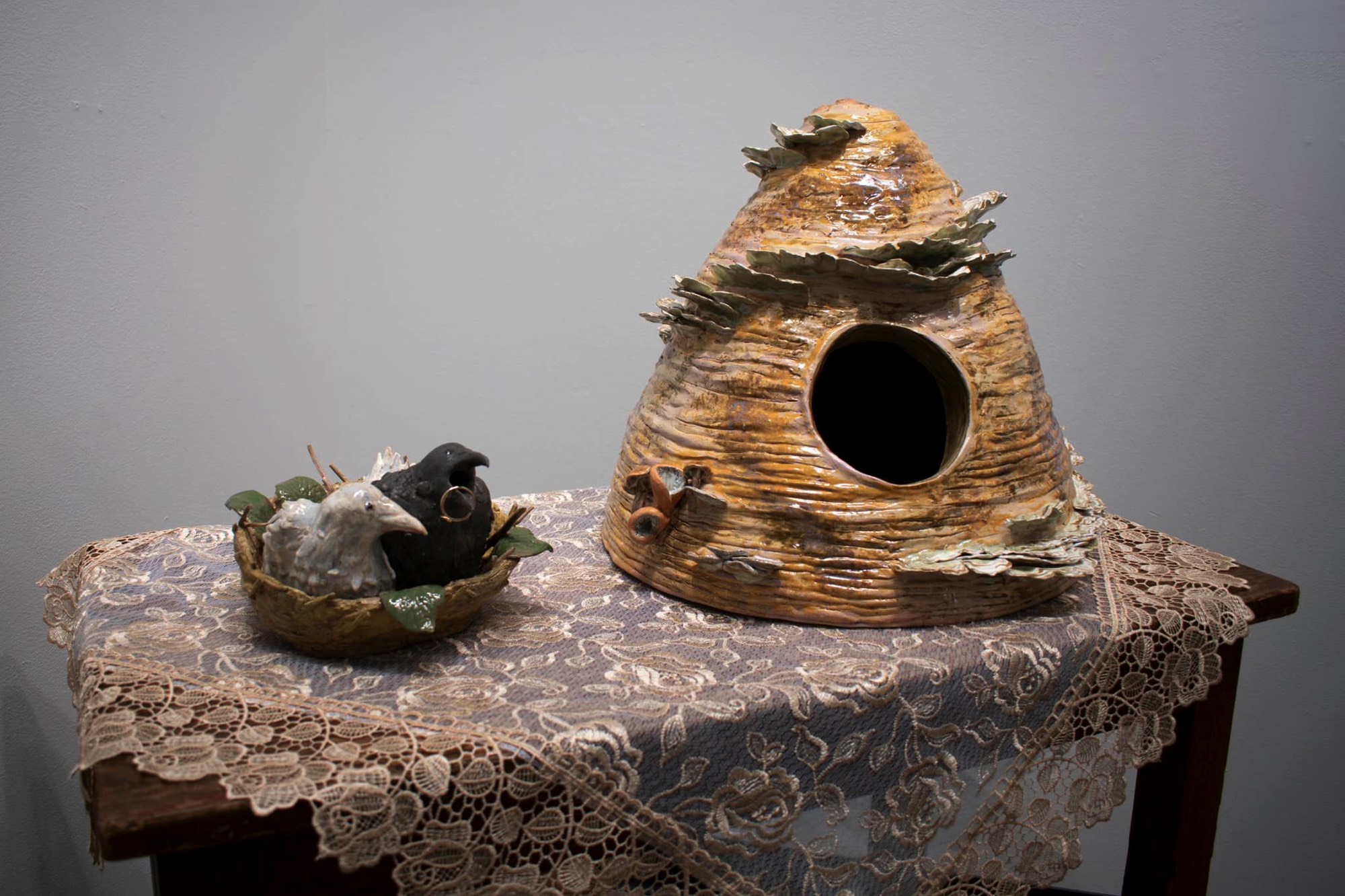 The theme of my senior exhibition, “Telling the Bees,” references the practice in which beekeepers have a responsibility to notify the bees of major life changes such as deaths, births, and rites of passage as an aspect of their care. I explore through metaphor the hive as a nest, tomb, shrine, medicine chest, portal, container, and oracle. The themes of motherhood, marriage, and grief are presented visually through various mediums, including drawings, prints, hand-built ceramics, and fiber arts like stitching and weaving, each presenting layered visual metaphors.