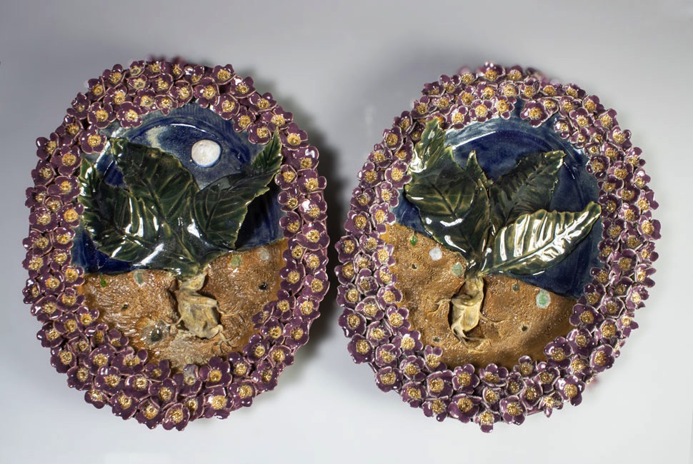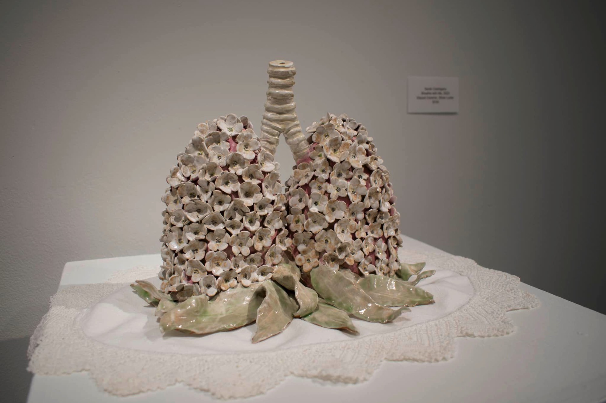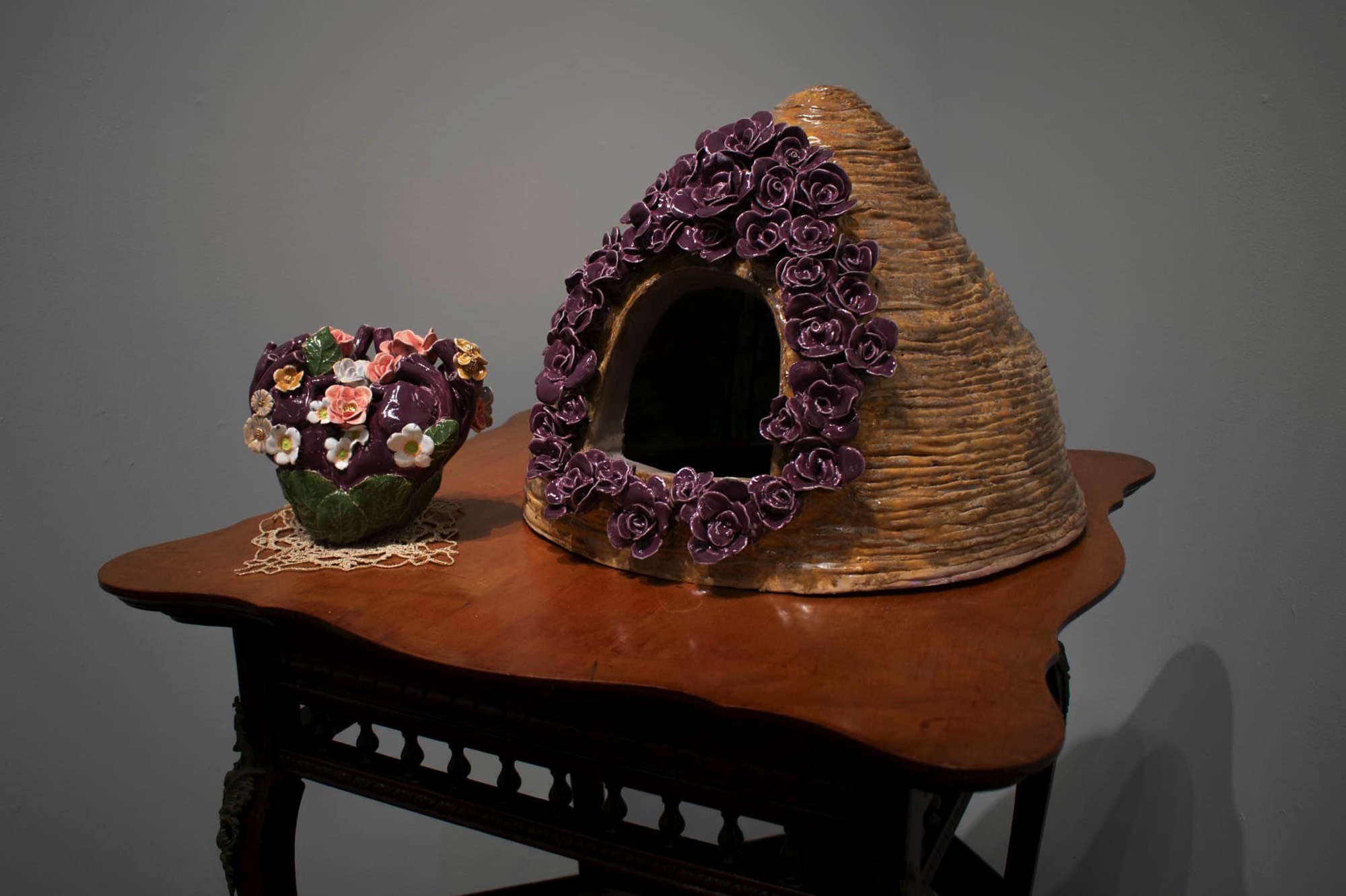 The theme of my senior exhibition, “Telling the Bees,” references the practice in which beekeepers have a responsibility to notify the bees of major life changes such as deaths, births, and rites of passage as an aspect of their care. I explore through metaphor the hive as a nest, tomb, shrine, medicine chest, portal, container, and oracle. The themes of motherhood, marriage, and grief are presented visually through various mediums, including drawings, prints, hand-built ceramics, and fiber arts like stitching and weaving, each presenting layered visual metaphors.